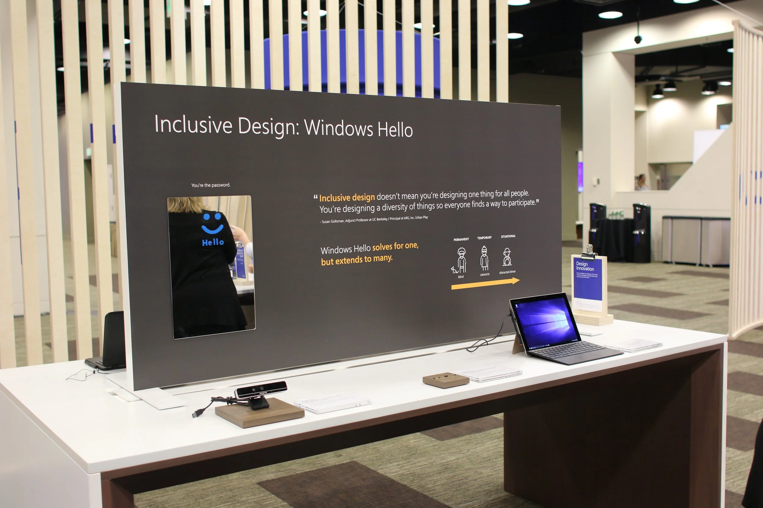 In this booth, we told the story of the Windows Hello IR Camera. The story touches on how Iteration after iteration led to a sleek integrated chip that enabled Windows Hello. Three iterations were displayed on the table showcasing the prototype journey. We took the opportunity to tie in Microsoft Inclusive design on the table backer where we showcased how accessible Windows Hello is.