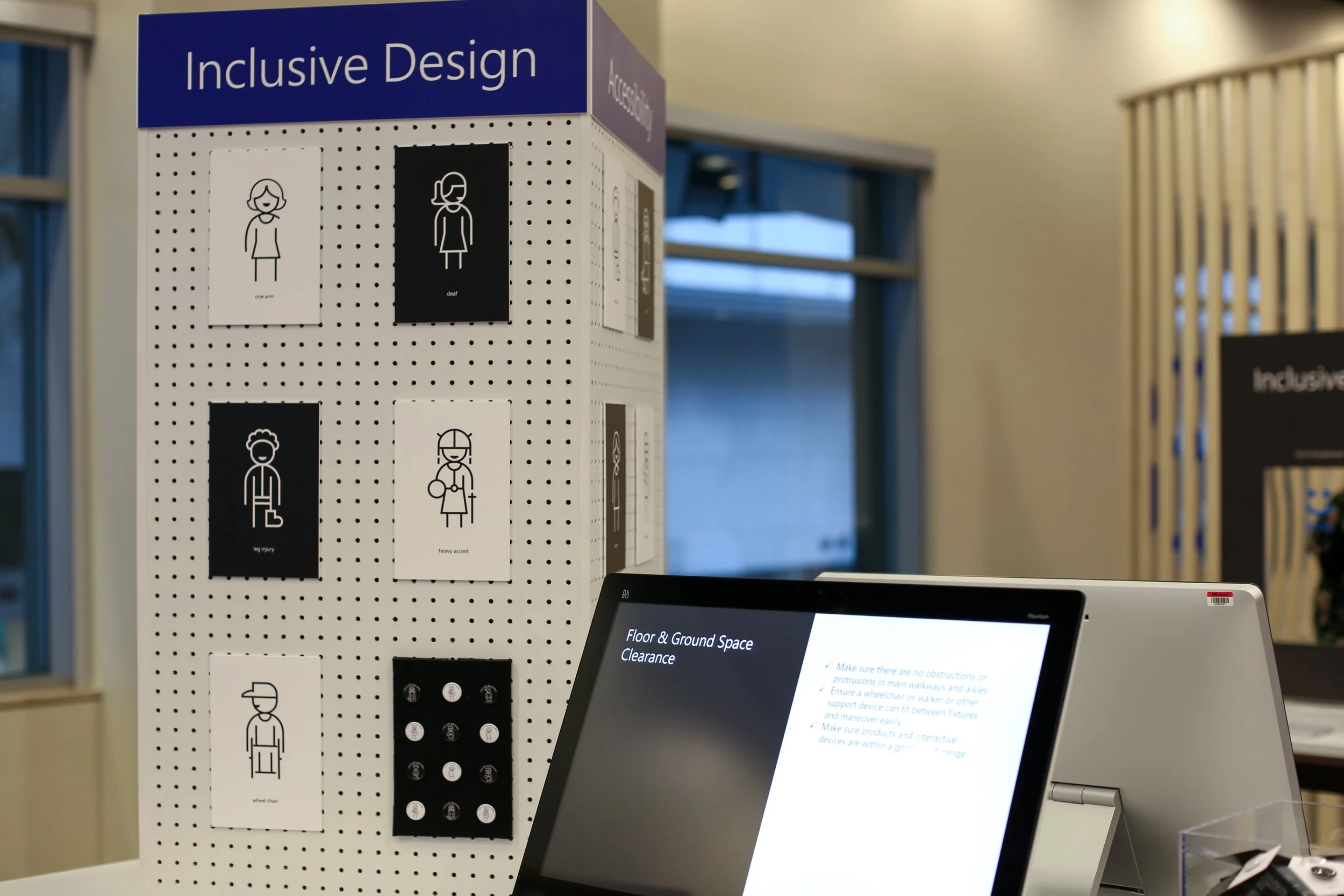 Microsoft’s Mission is to empower every person and every organization on the planet to achieve more. We worked with the Microsoft Accessibility Group to come up with iconography and a designated area to help users become familiar with Microsoft’s Accessibility and Inclusion efforts across products, people and programs. We included these icons on the table signs of each booth.